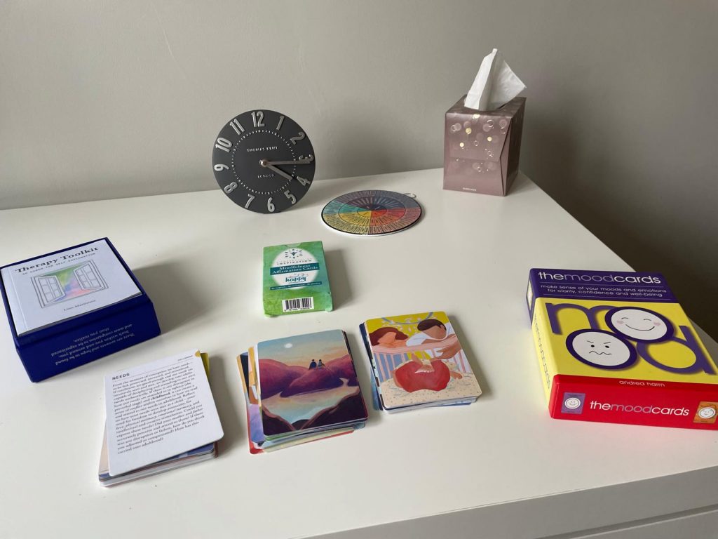 In addition to traditional talking therapy, we can integrate creative methods into our work. I have therapy cards, which many clients find useful to provide deeper insights and enhance self-discovery.